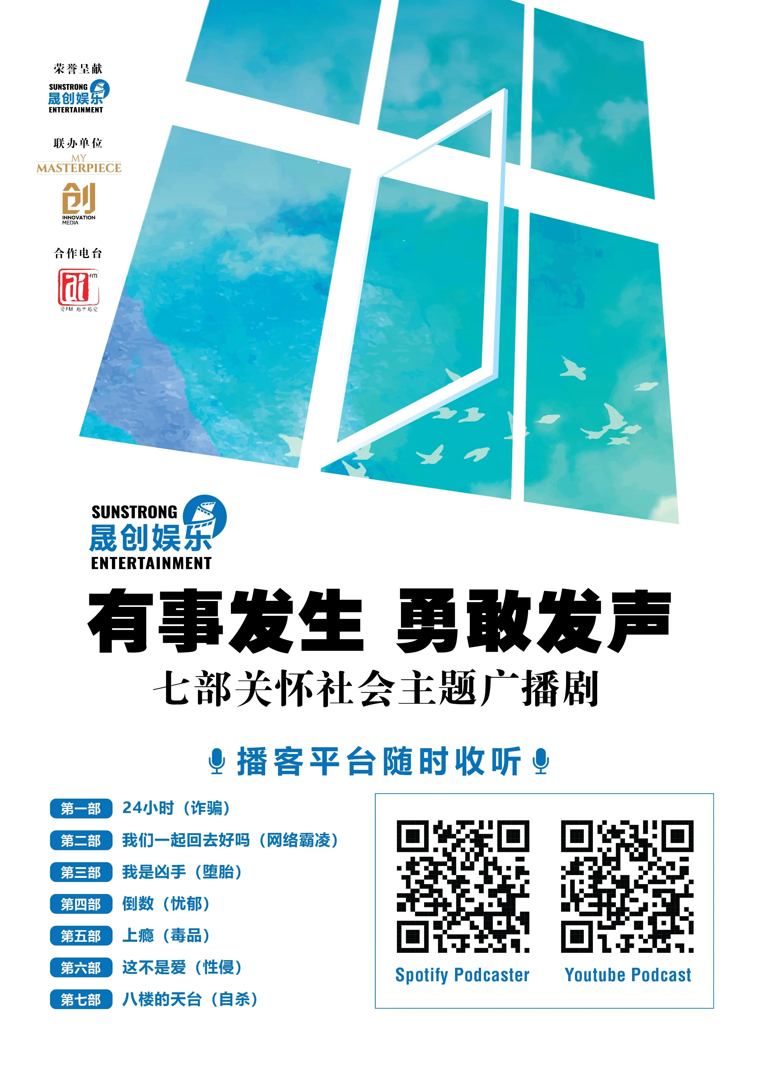 在这个信息飞速传递的时代,晟创娱乐和My Masterpiece携手呈现了以“有事发生,勇敢发声”为主题的一系列社会公益广播剧。
