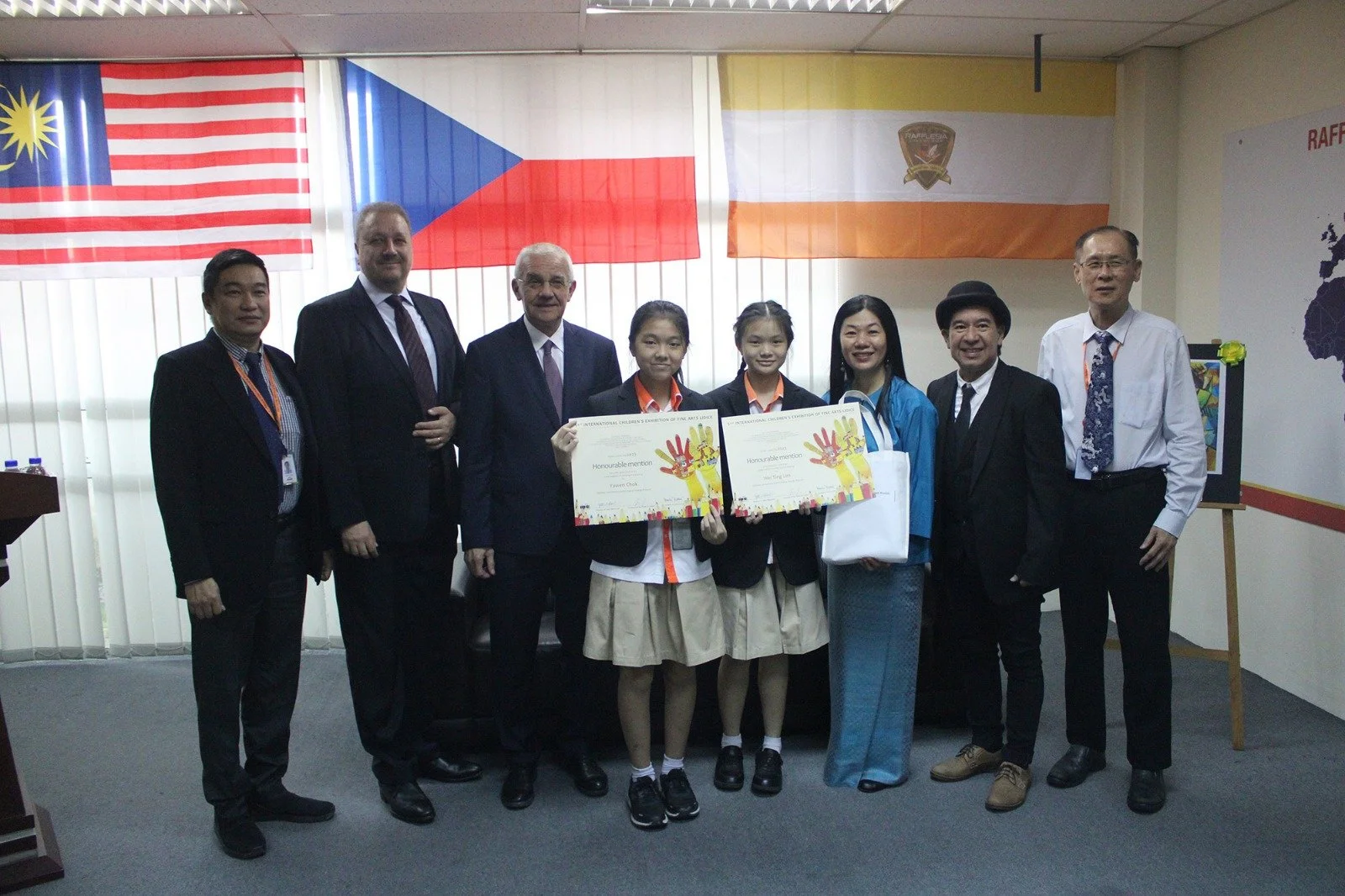 莱佛⼠亚国际学校加影校区很荣幸接待了尊敬的捷克共和国驻马来西亚⼤使尤拉吉·考德尔卡(Juraj Koudelka)先⽣阁下,他到访学校并为两位杰出学⽣⽯雅汶和林薇廷颁发荣誉奖,认可她们在第51 届利迪策国际⼉童美术展(ICEFA)中获得了显着的成就及荣誉。